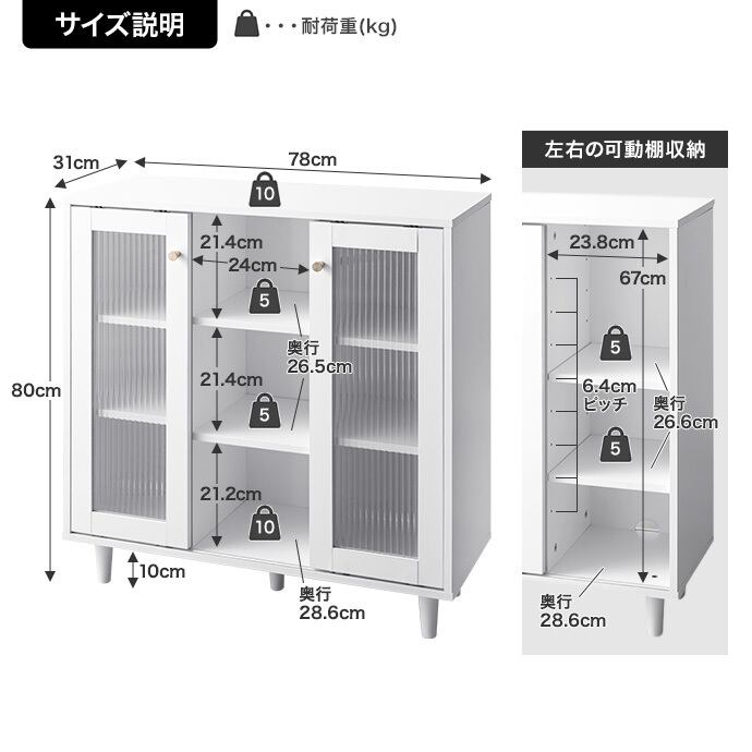 【耐荷重】天板:約10kg、中央収納棚:各約5kg、左右収納可動棚:各約5kg、底板:約10kg